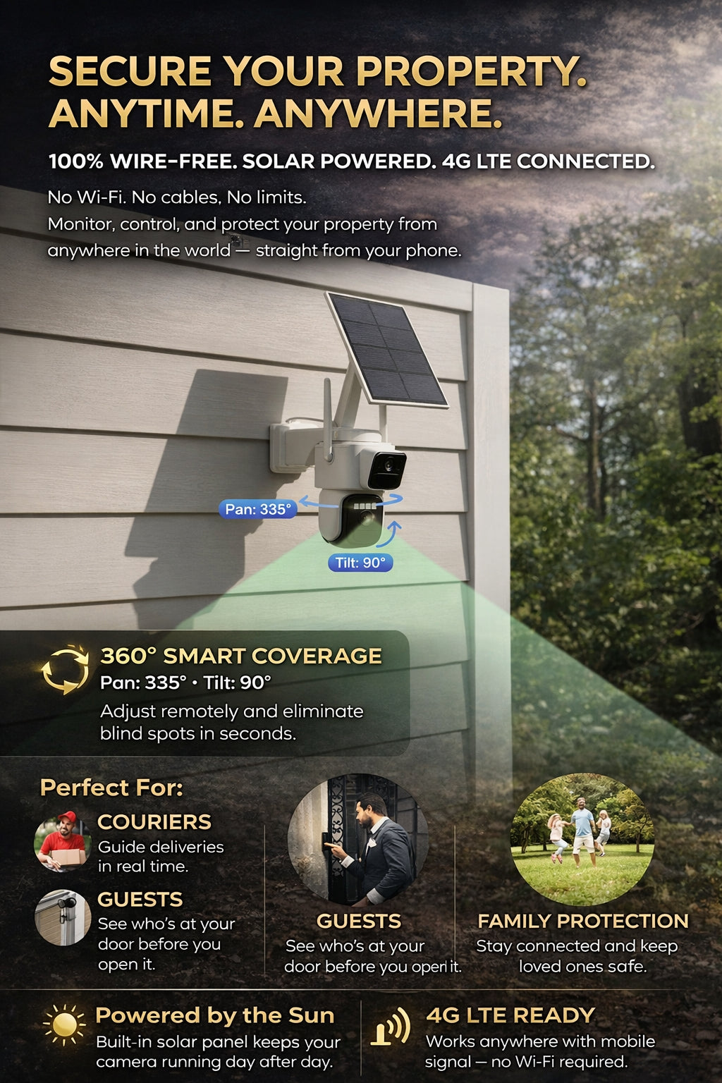 Works without Wi-Fi and electricity, runs on solar and 4G. Monitors your property 24/7.