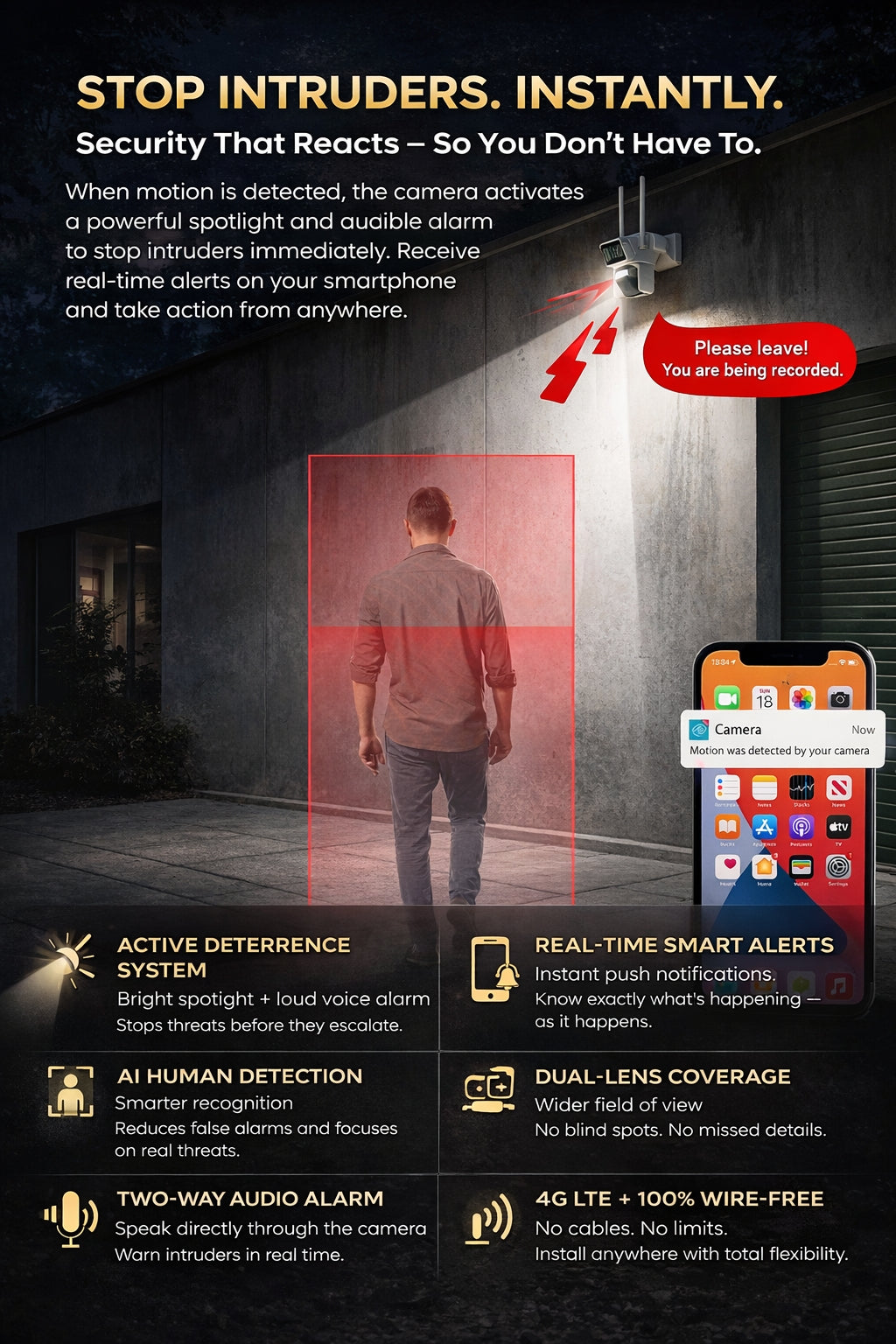 Enhance your security with an intelligent deterrent system. When the camera's human detection is triggered, it automatically activates a powerful spotlight and emits a voice alarm to scare off potential intruders. Simultaneously, you’ll receive an immediate APP push notification on your phone, so you're always aware of any suspicious activity. This multi-layered approach gives you proactive protection and a powerful way to be secure .Priority Shipping, On Us. We ensure your protection arrives swiftly. Enjoy complimentary delivery on every order over $150.
